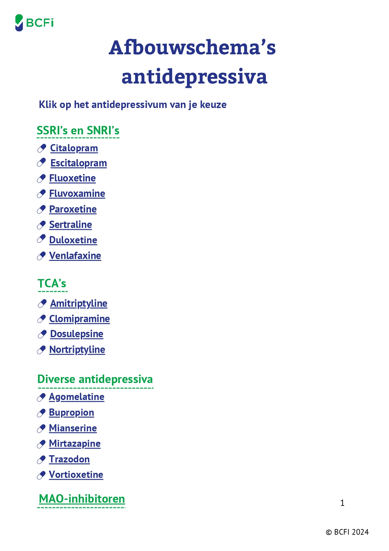 In de e-learning ‘Afbouwen van antidepressiva‘ ontdek je hoe je een patiënt informeert, motiveert en begeleidt bij het afbouwen van antidepressiva. In een samenvattende fiche voor je praktijk zetten we alle tips op een rij. In de afbouwschema’s vind je voor elk antidepressivum concreet advies.